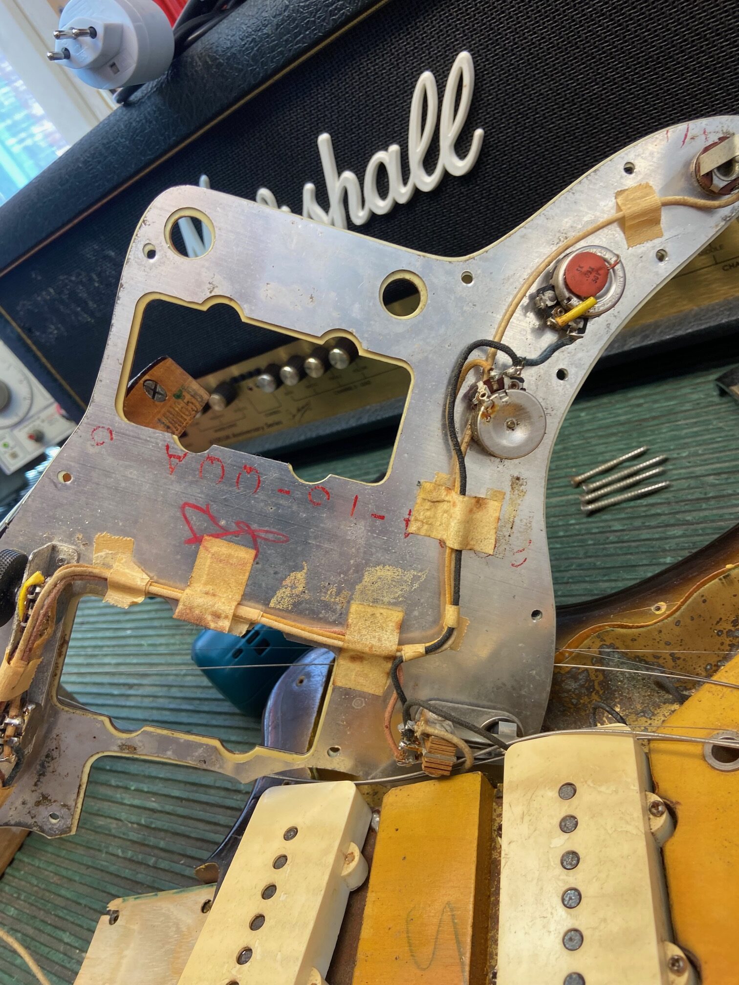 Pickups & Electronics: Original Grey Bottom Pickups. Neck Pickup might be rewound, RWRP style, since the middle position is hum-cancelling, which is pretty uncommon on these Jazzmasters. Cables and pots appear in very nice original condition. Volume pot might be an old replacement. The volume and tone knob and the switch tip are replacements.