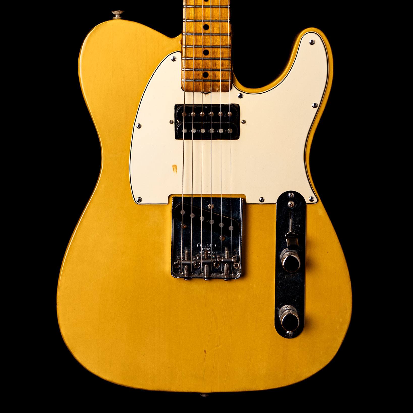 Heavily modified Fender Telecaster from 1967. Body and neck are refinished and the fingerboard is re-fretted. A vintage Gibson T-Top humbucker is mounted in the neck position. The routing in the body was extended for this purpose. In the bridge position is a no-name T-style single coil which sounds surprisingly good, so we kept it installed. When we received the guitar it was fitted with what we thought was an inappropriate Tele bridge with six individual saddles. We replaced it with an early 70s Fender Tele bridge which is more in harmony with the guitar’s charm.
