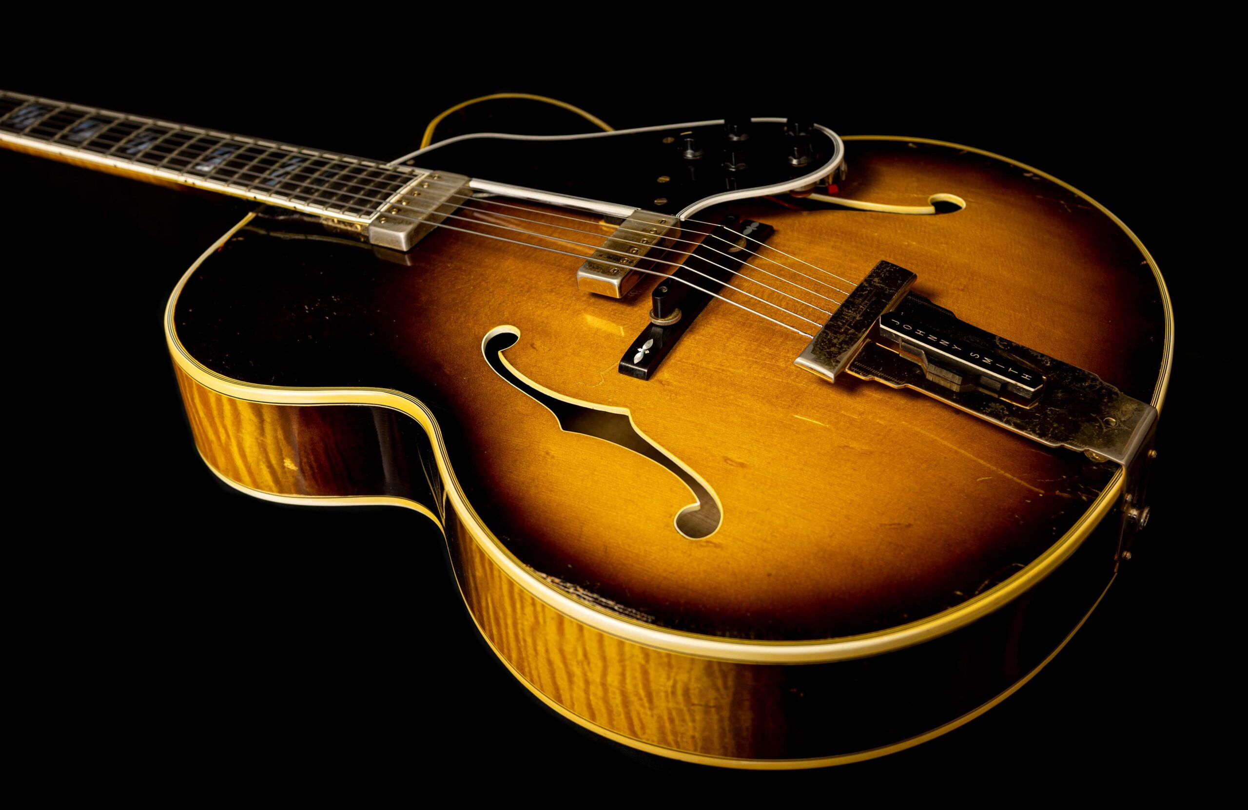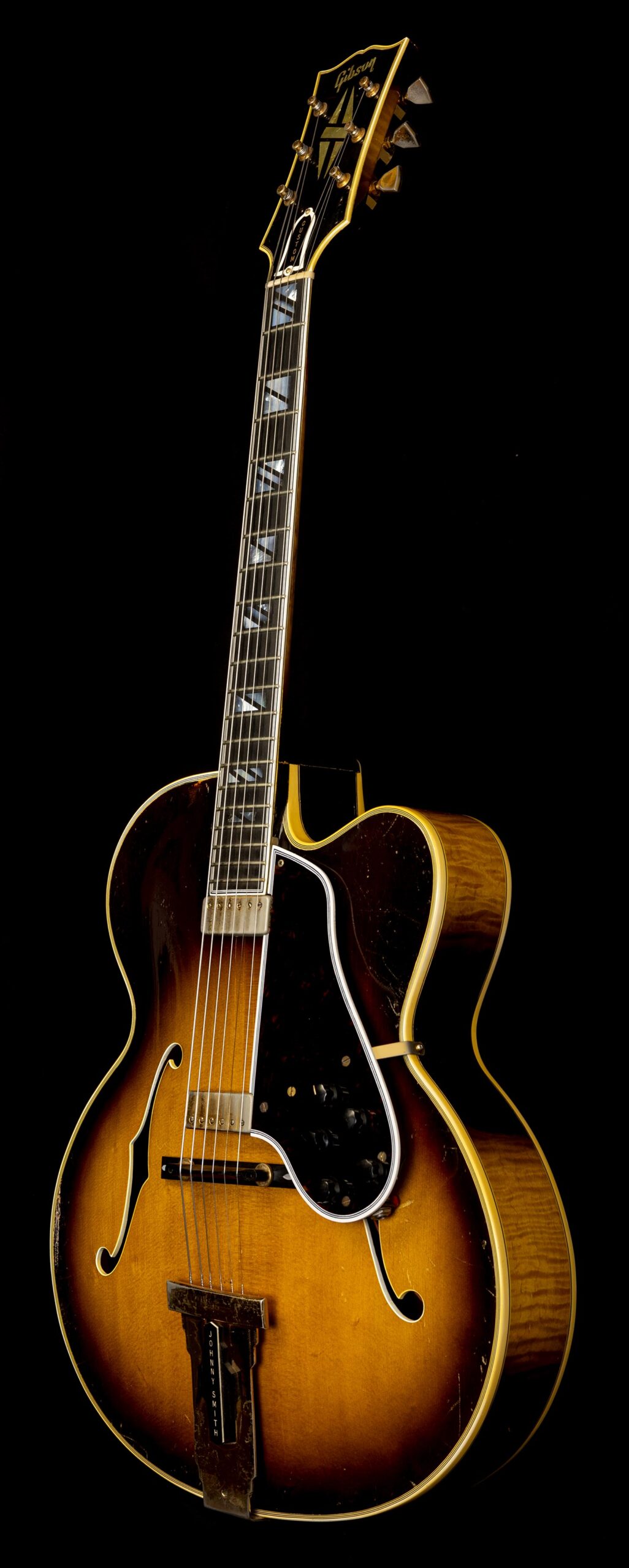 Here we have one of the most impressive jazz guitars ever! The Gibson Johnny Smith with 17″ body made of beautifully flamed maple and floating humbucker pickups.