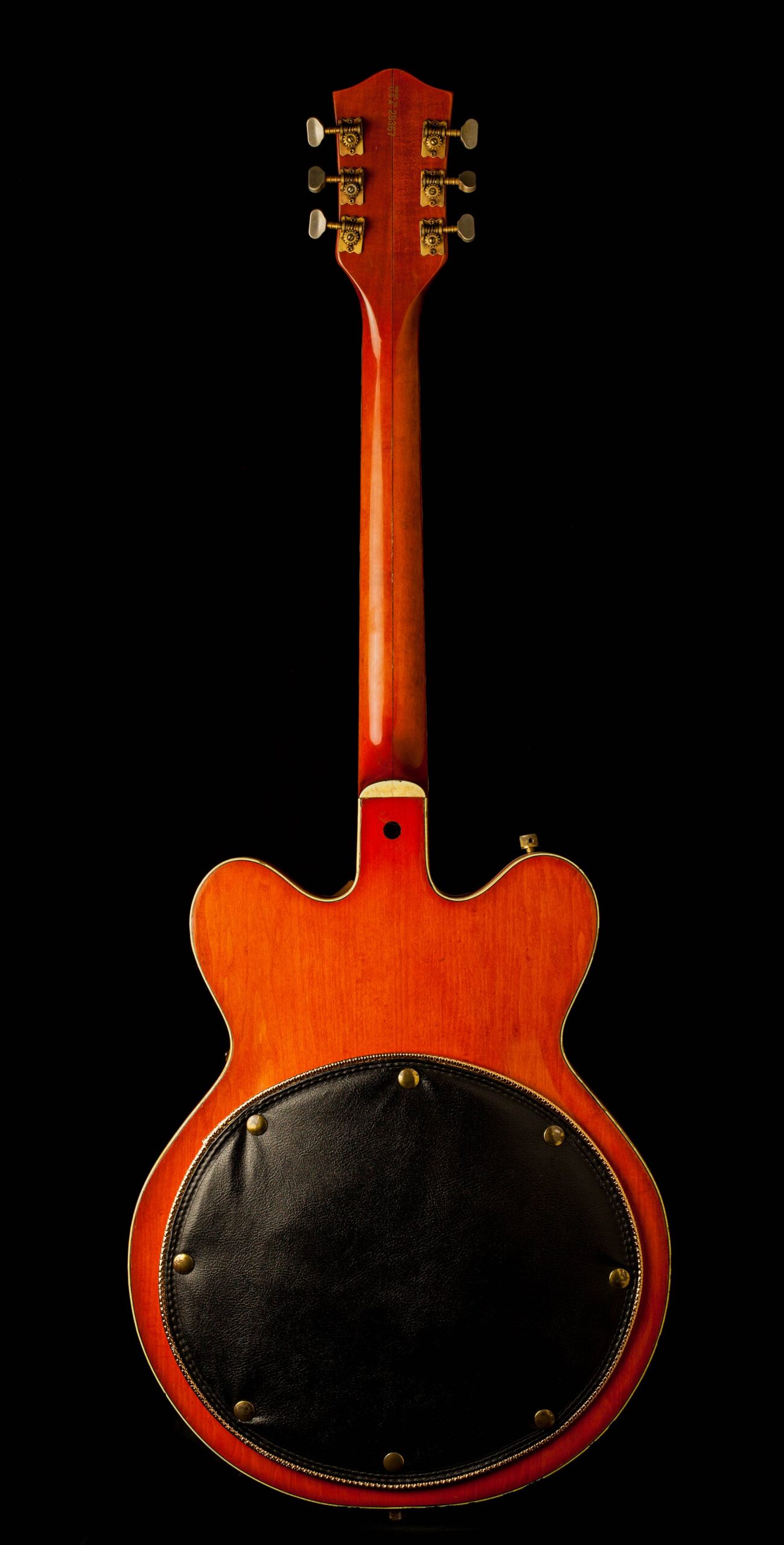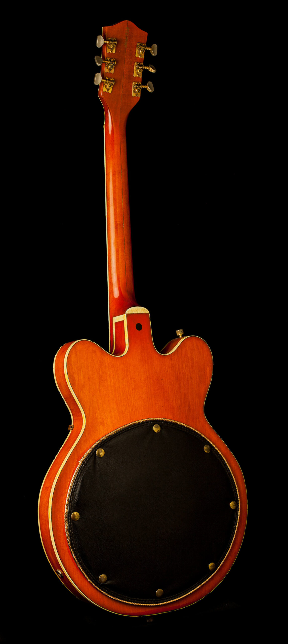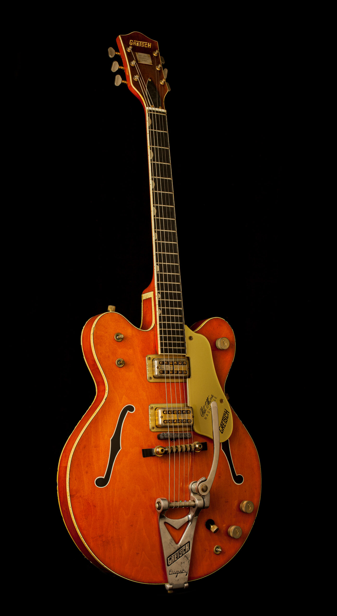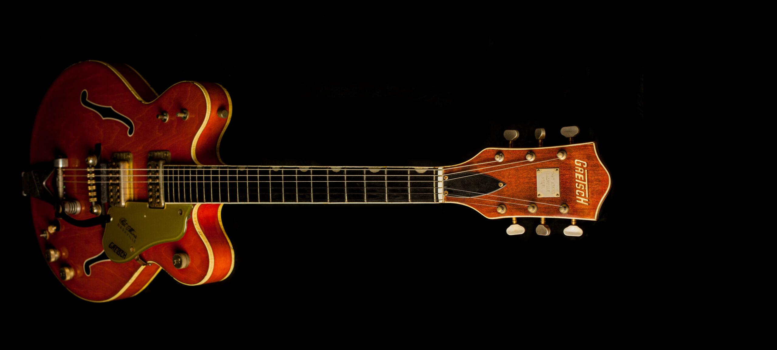 Gretsch 6120 Chet Atkins Nashville with nice Filtertron pickups with moderate approx. 4kOHm output. The sound is incredibly dynamic and crystal clear. All parts are original. The binding devil has also left his mark on this Gretsch, but the guitar has an exceptionally beautiful ebony fingerboard with the characteristic and stylish thumb nail inlays. In addition, the damper system is completely present and functional. So let’s go for some country picking fun.