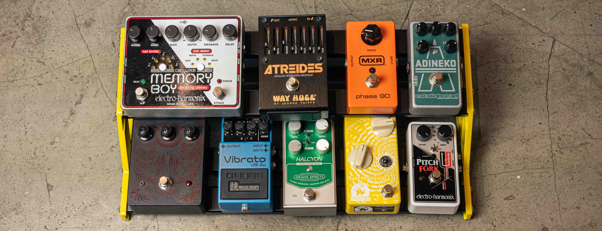 Two-level pedalboard in a very convenient layout. The lower level is perfect for pedals up to MXR size. Underneath the upper level you will find enough space for power supply and cable clutter.