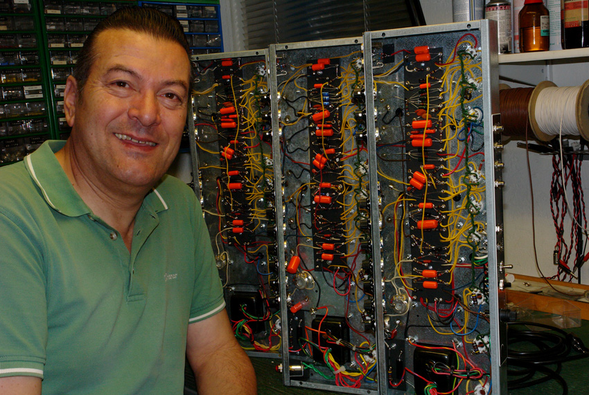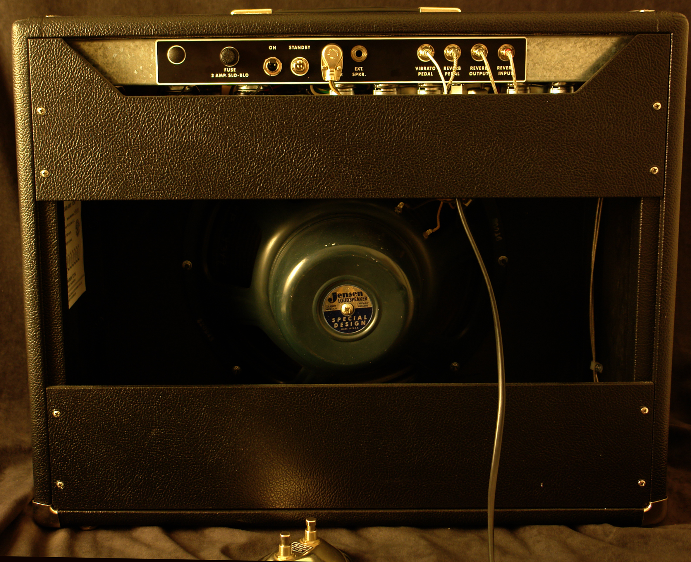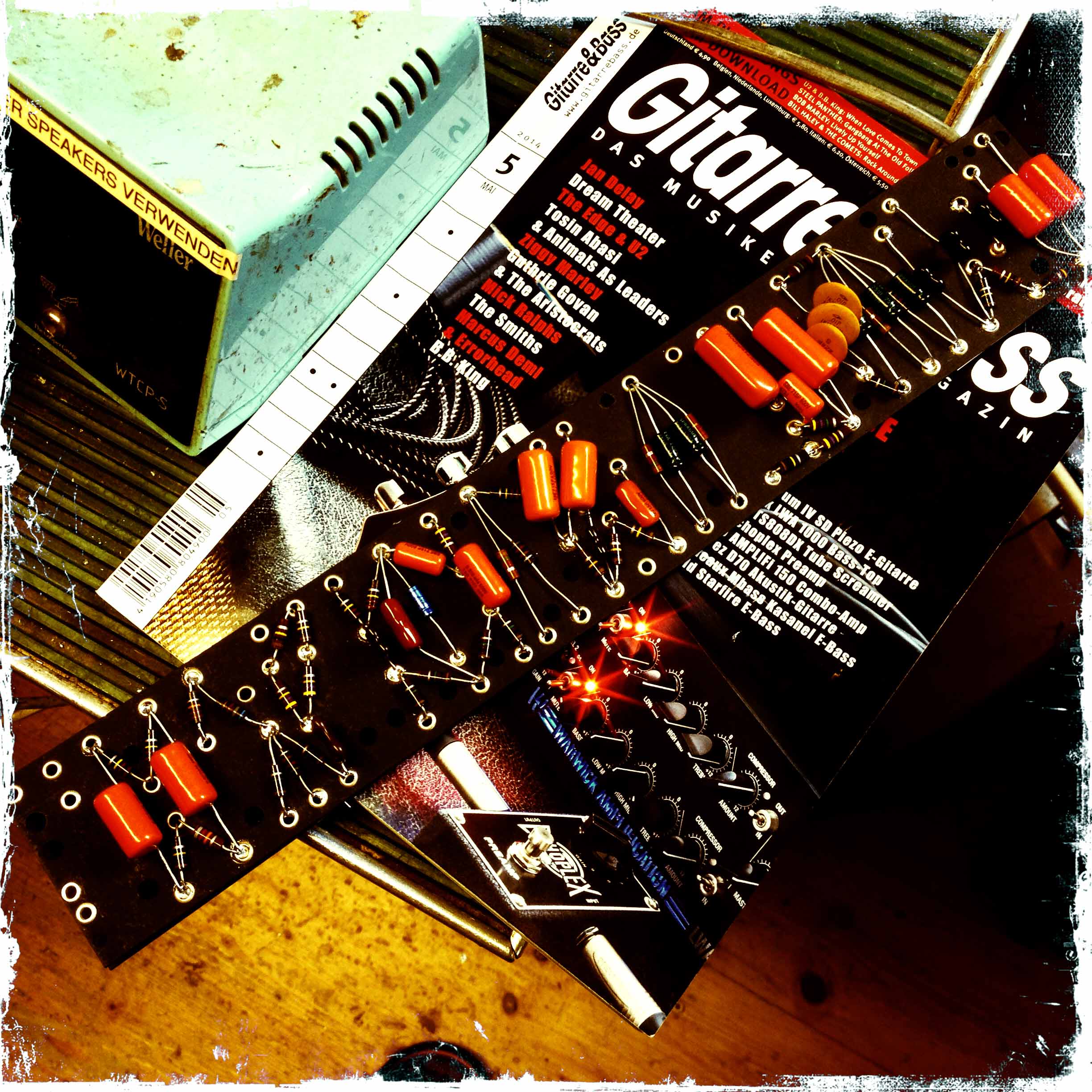 Die Idee einen Verstärker für den anspruchvollen Gitarristen zu bauen, welcher getreu den alten Vorbildern ein Maximium an Klangfülle und mit speziellen Effekten ausgestattet ist, war mir schon lange ein Anliegen. Ausgerüstet mit einem 15″ (1956 P15N) Jensen Lautsprecher und einer 45W push-pull Endstufe mit zwei 6L6WGC Röhren ist die Leistung nicht überdimensioniert, kann aber ohne weiteres auch grösseren Einsätzen genügen. Der Sound ist voll und warm (FAT), die Höhen seidig bis funkelnd. Dies macht den FAT BASTARD sowohl für den JAZZ Musiker wie auch für SURF und BLUES Gitarristen interessant. Der Hall kann stufenlos von warm bis agressiv beigemischt werden. Sehr speziell ist das Harmonic Vibrato. Eine aufwändige Schaltung, welche nur für kurze Zeit in den frühen sechzigern Verwendung fand, erlebt nun eine Renaissance! All dies vereint in einem robusten Chassis und auf eylet-fiberboard HANDVERDRAHTET garantiert Langlebigkeit und Langzeit-Spielfreude. -Carlo Milan In der Mai-Ausgabe 2014 des Gitarre&Bass wird unser Fat Bastard Amp vorgestellt und getestet. Zitat „Die Tonqualität des Fat Bastard-Amps ist maximal ausgereizt. Das Ziel, einen ultimativen Clean-Amp zu kreieren, wurde definitiv erreicht.“ Wir bedanken uns beim Gitarre&Bass für den ausführlichen Test! hier gehts zu Gitarre&Bass Zitat von Hank Shizzoe: „Und ich schwärme immer noch. Ohne jeden Zweifel der beste Amp, den ich je gespielt habe. Durchdacht, clever, unglaublich „responsive“, dynamisch, Vibrato from heaven – und extrem beseelt. Einfach aussergewöhnlich!“ hier gehts zu Hank Shizzoe Website