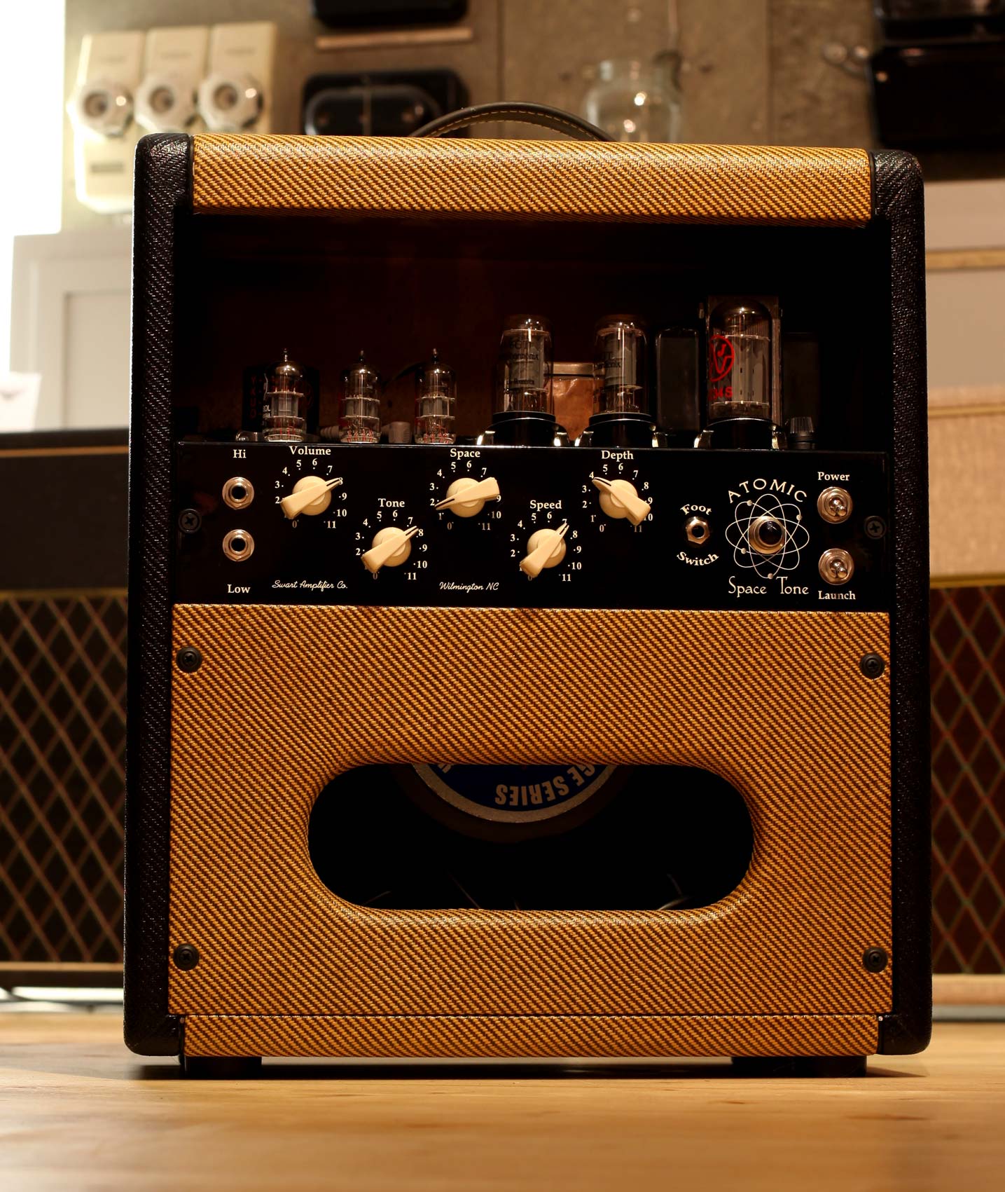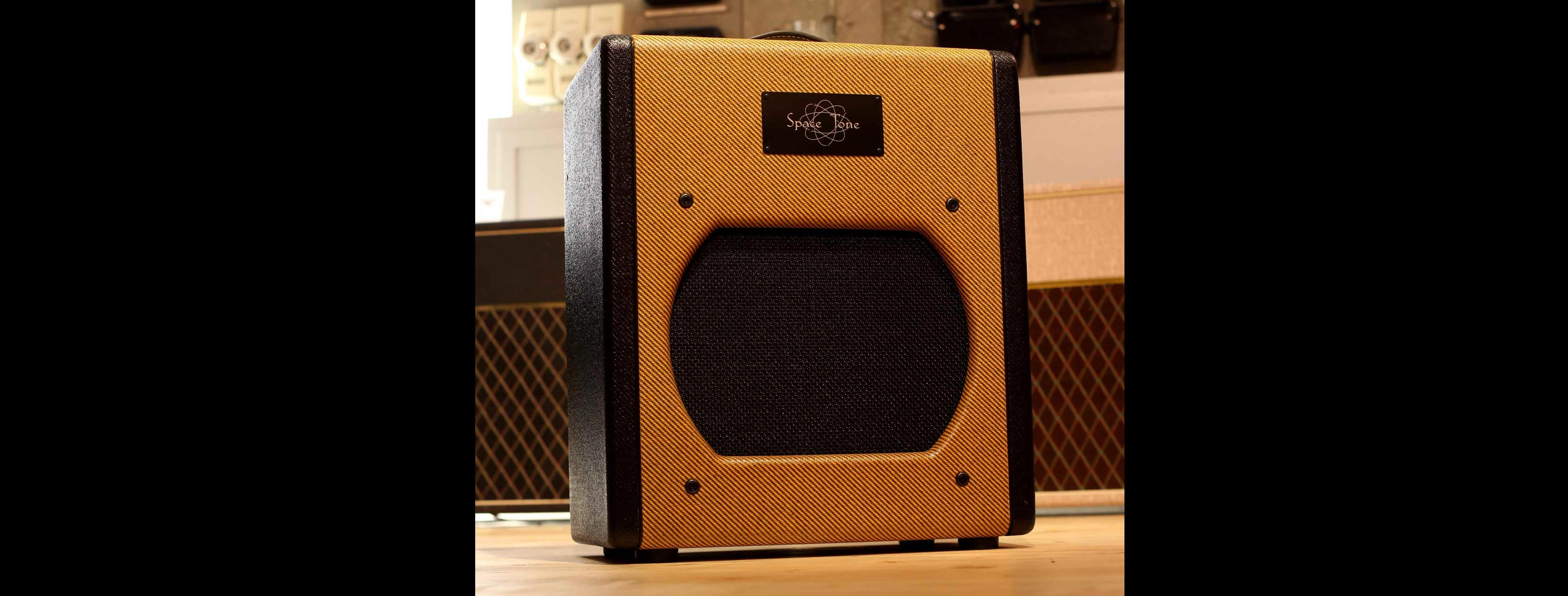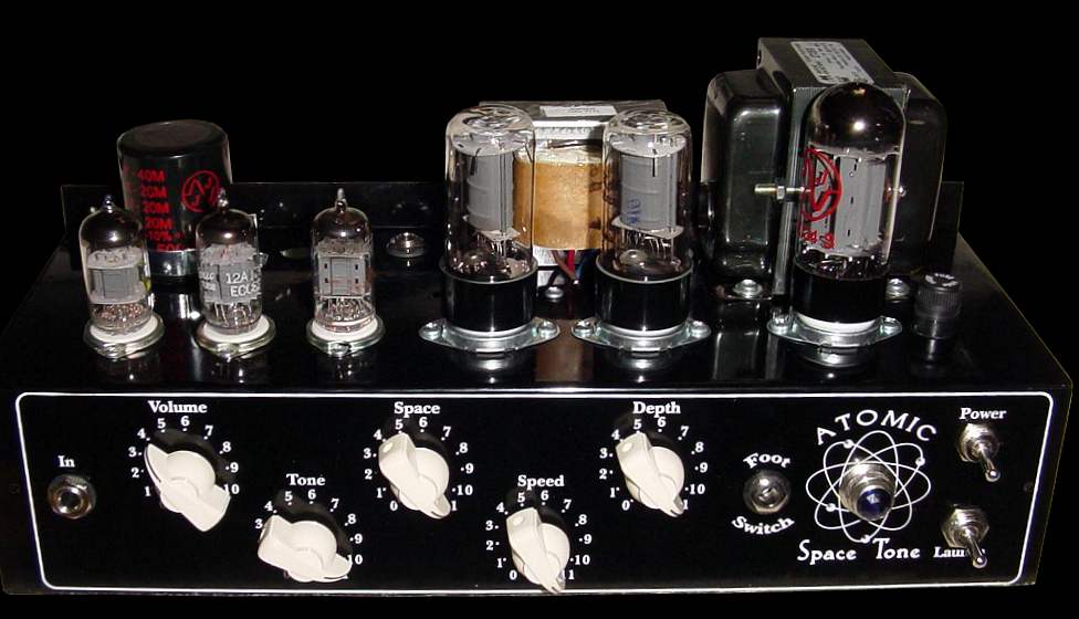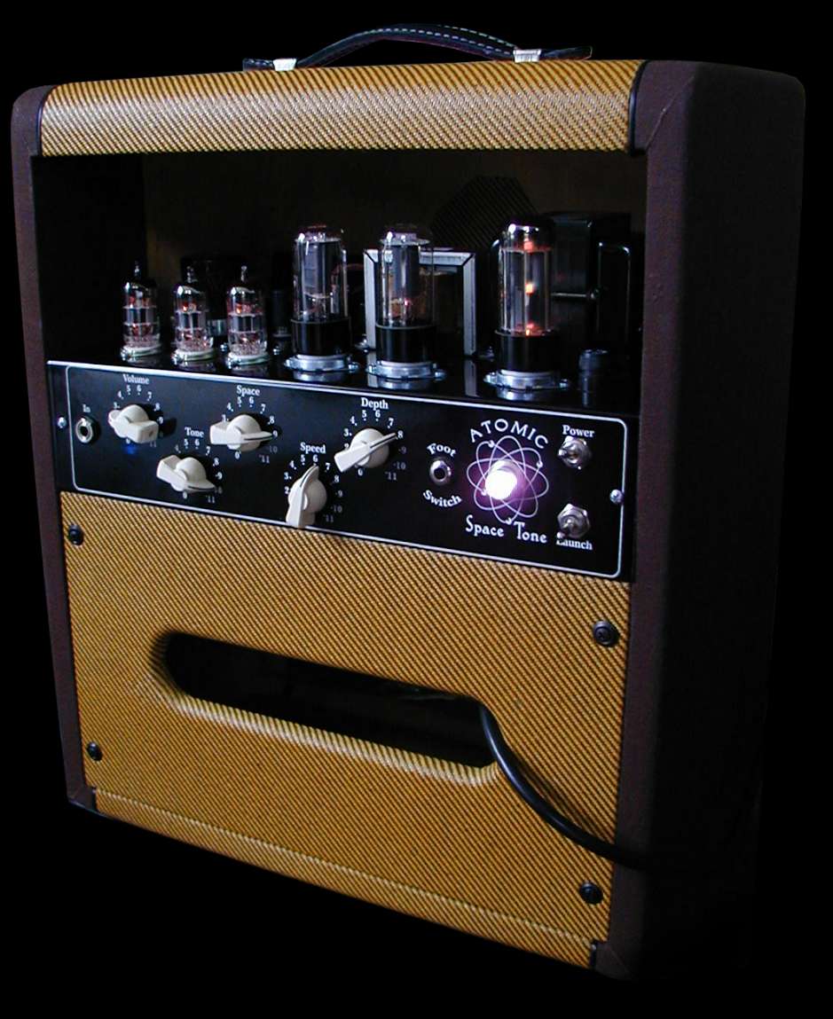 And a hand-made, finger jointed pine cabinet covered in light with dark tweed tweed side panels. This cabinet is part of the magic of the Atomic Space Tone – We tested many different cabinet configurations and wood choices until we found the magic of the AST combo.
